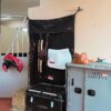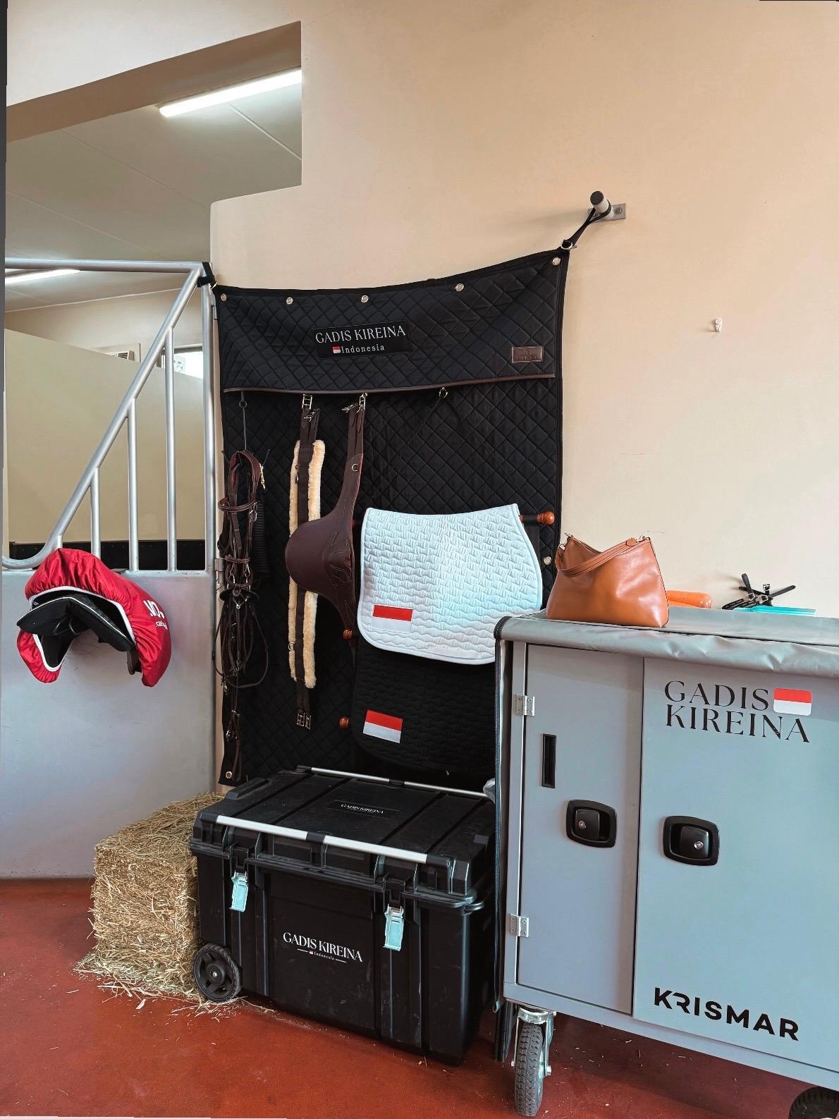 This Stable Curtain Waterproof features five reinforced hook and loops to attach to the stall. Under the flap are five snap hooks to attach accessories such as bridles, rack for rugs, grooming hook, etc. The snap hooks are carefully put away behind the flap with vegan leather Kentucky logo so you don’t see them. The vegan leather piping on the flap and the fancy vegan leather Kentucky logo all contribute to this fancy look.